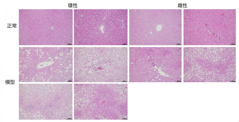 模型组大泡性脂变显著,呈弥漫或散在分布,小叶内炎症轻微,门管区炎症重于小叶内炎症,少见气球样变性,门管区及其周围纤维化明显,可形成间隔分隔肝实质。