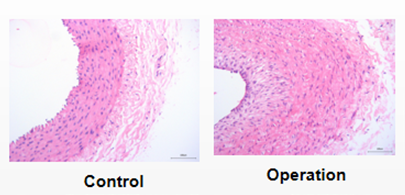 血管形成术后再狭窄形成的关键在于血管平滑肌细胞增殖移行致内膜增生,因此构建兔颈动脉球囊损伤模型对术后内膜增殖抑制机制和药物治疗进行研究。目前有2种方法球囊损伤术建立颈动脉损伤模型。1)颈总动脉球囊损伤术:兔颈总动脉球囊损伤术后狭窄模型,可模拟经皮腔内冠状动脉血管成形术(PTCA)术后再狭窄的发生发展。2)高脂饲料+球囊损伤术:目前广泛应用于腹、髂主动脉粥样硬化及颈动脉狭窄模型的建立, 球囊损伤程度的大小成为影响造模成功的关键之一。